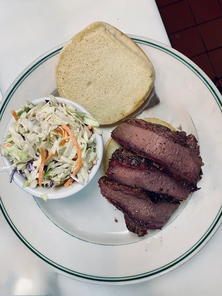 choice of brisket +$2, pulled pork or pulled chicken served on hamburger bun with one side
