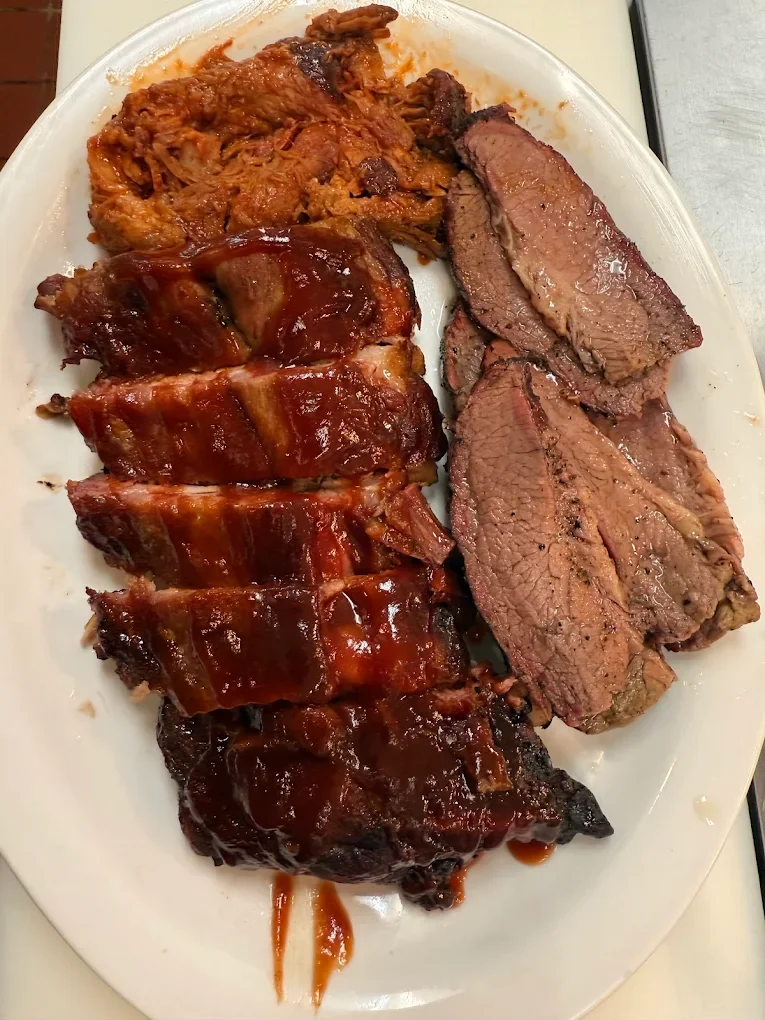 Baby back pork ribs hand rubbed in our simply delicious secret rub and hickory smoked for 4 hours and glazed in our home made sweet BBQ sauce add $2 for brisket with adding extra meat